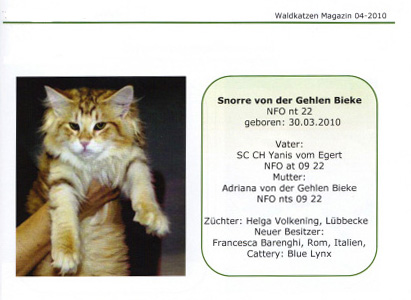 Il nostro Snorre è comparso nel Waldkatzen Magazin, la rivista tedesca degli allevatori dei Gatti Norvegesi delle Foreste !